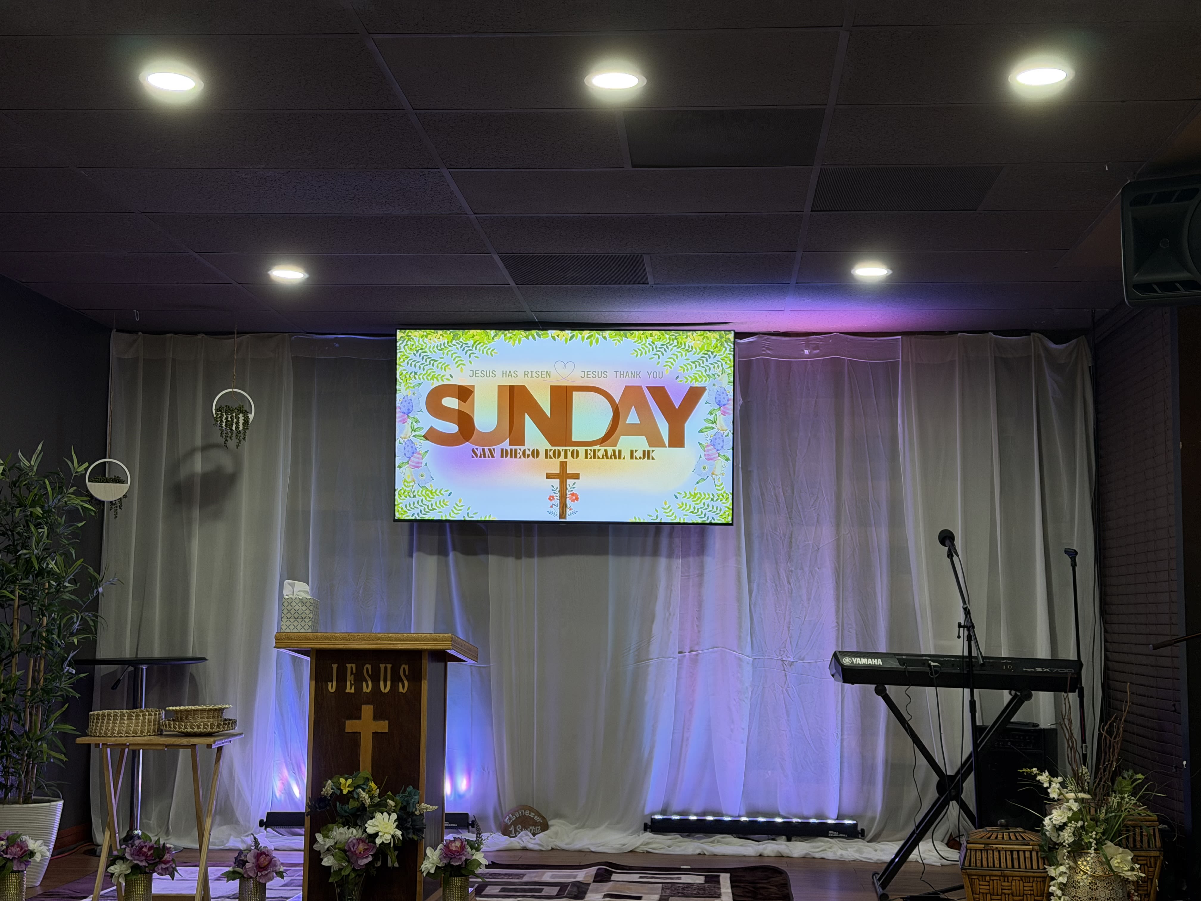 The room fit seven rows of five chairs. Where the pastor stood was a patterned rug, a keyboard to his left, plants on either side, a TV behind him and a pulpit that had a cross and the name “Jesus.” A box of tissues rested on it.